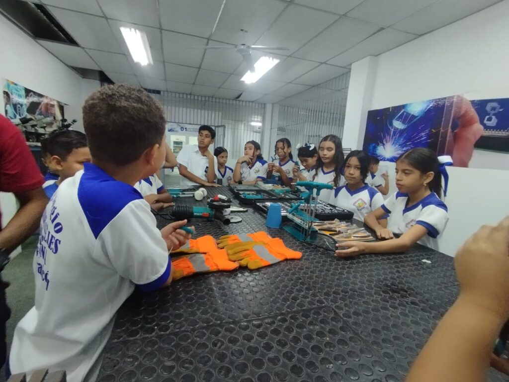 La ruta concluyó en la estación de Metalmecánica, donde los niños y niñas exploraron los conceptos fundamentales de la ingeniería del metal. Conocieron de cerca, los procesos de fabricación y los tipos de actividades se desarrollan en el taller.